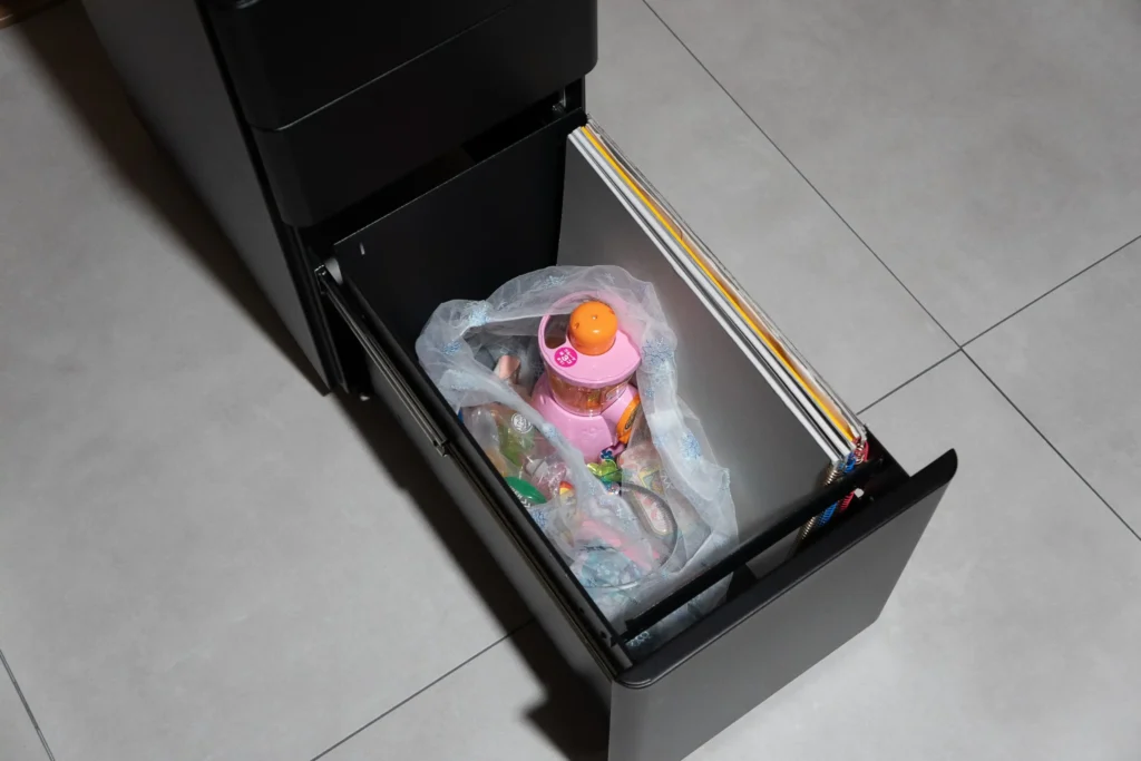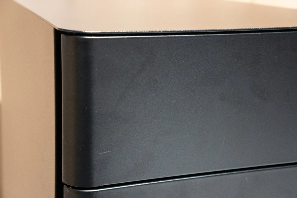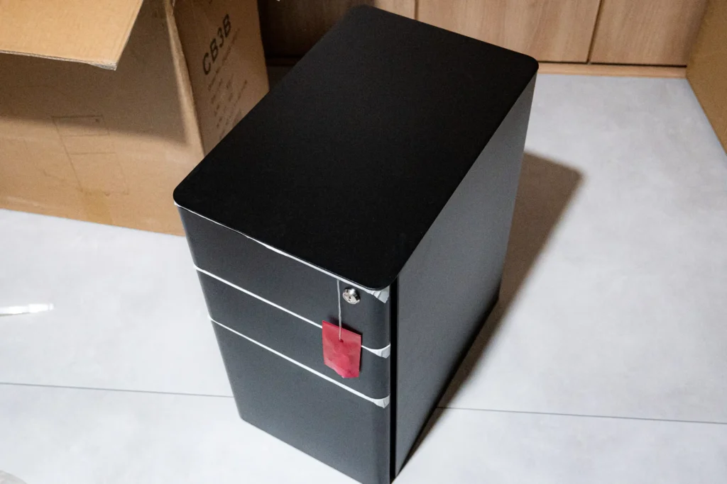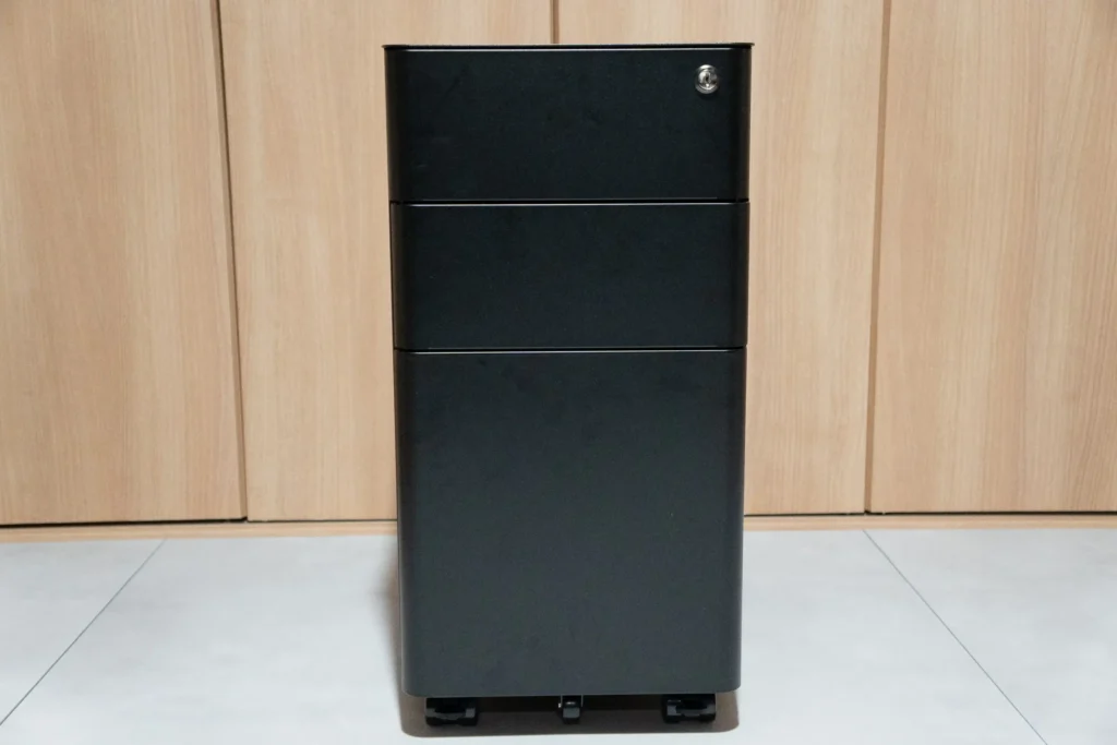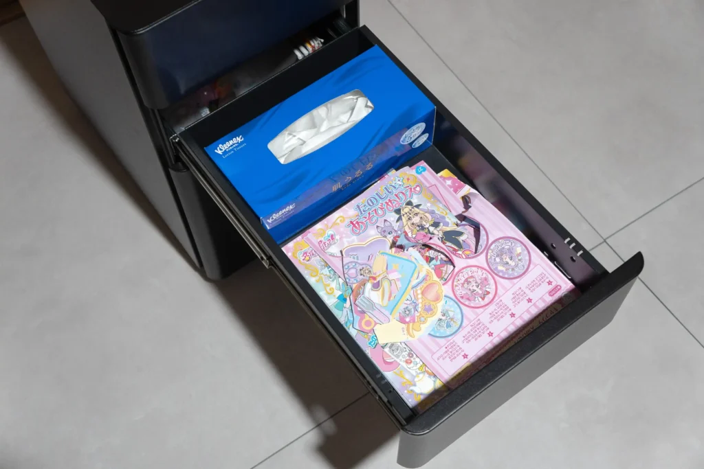 スチール製のボディはマットな質感で、いわゆる「オフィスワゴン感」があります。ただ角に丸みがあるデザインなので、無機質な印象は思ったより薄いです。子ども部屋に置いても事務所っぽくなりすぎず、E7 Clickのブラックフレームとも自然に馴染みました。