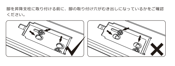 昇降支柱に脚を取り付ける前に、脚の取り付け穴がむき出しになっているか必ず確認します(説明書にも◯×で明示されている重要ポイント)。