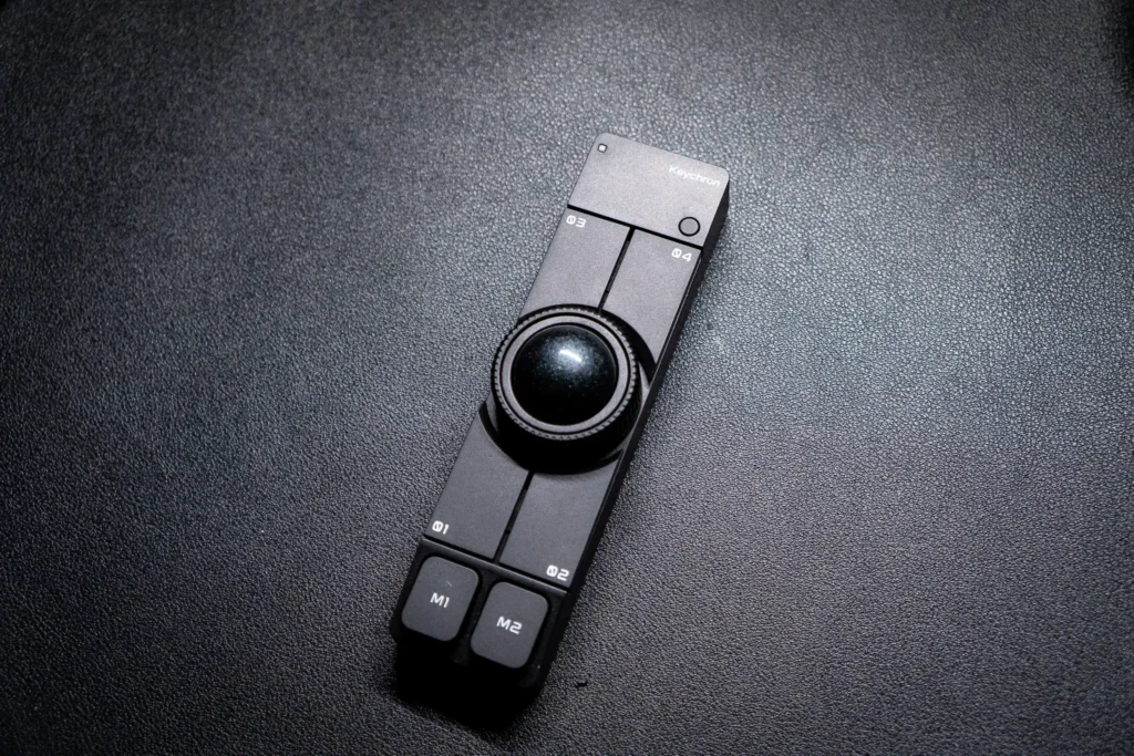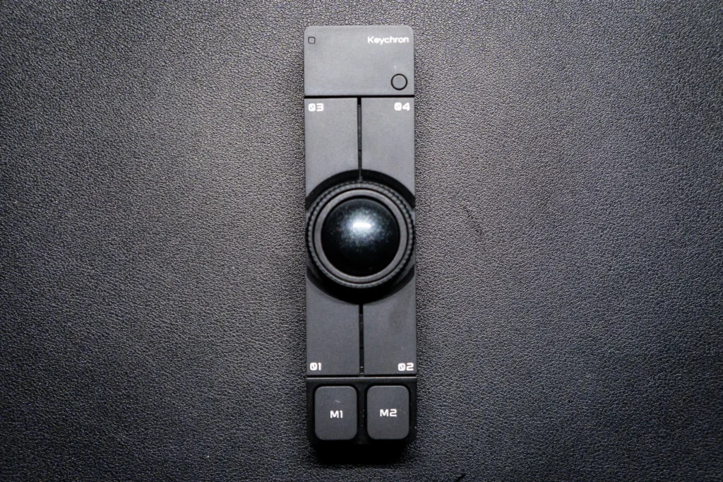 ボタンの形状は、M1・M2がボディの長辺端に縦に並んでいます。どの向きで置いても親指か人差し指が自然に当たる位置に設計されています。ボールを囲む01〜04は、ボールのすぐ周囲に配置されています。押したときのストロークは浅く、力を入れずに反応します。誤押しが気になるほど軽くはなく、意図して押す力加減で確実に入ります。