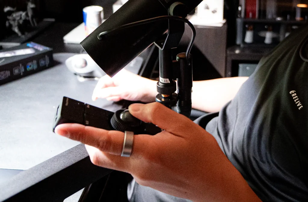 SHURE SM7dBは感度が高く、リクライニングした距離からでも拾ってくれます。リベルノヴォオムニはリクライニング時の姿勢が安定しているので、長時間この体勢でいられます。そこにNape Proが加わって、手元の操作が完結した。