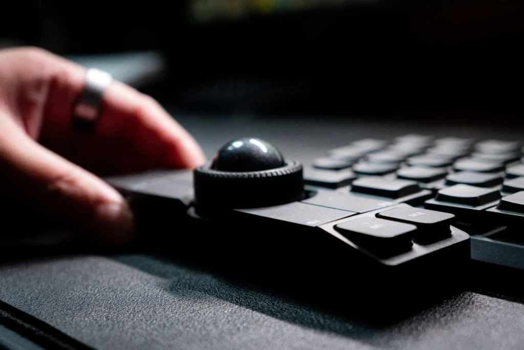 ペンタブやiPadの横に斜めに置いて、6ボタン全部にショートカットを割り当てる使い方です。ボールでのカーソル操作を使わず、ボタンだけを左手デバイスとして運用することもできます。コピー・ペースト・取り消し・やり直しなどを片手で完結させたいクリエイターに向いています。