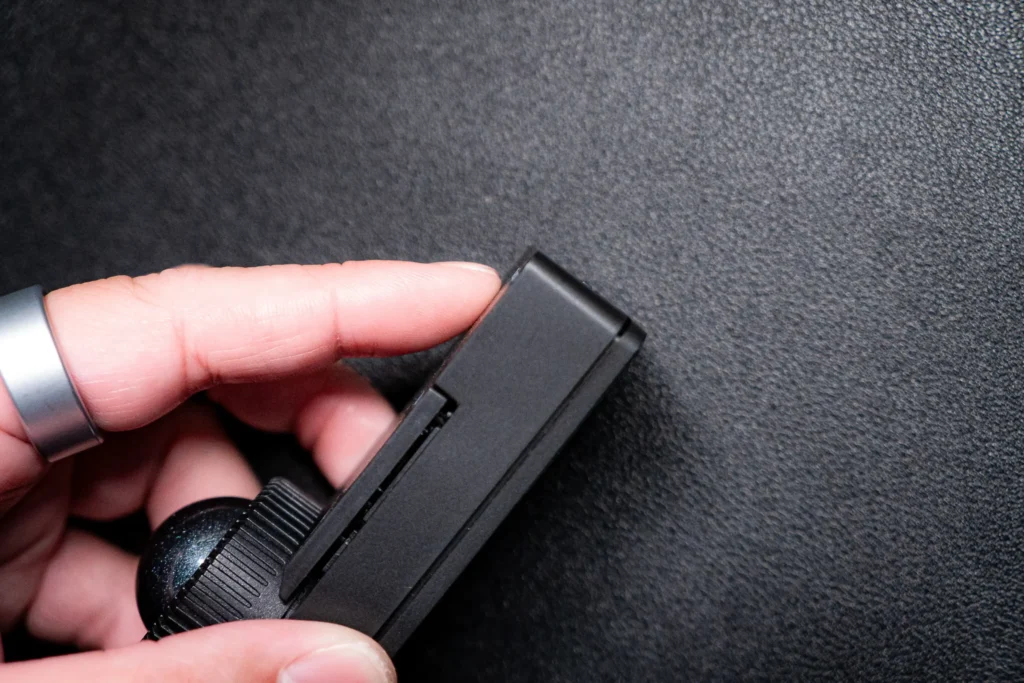 本体の素材はプラスチック製。ただし、薄さ19mm・幅34.7mm・全長135.2mmというバー型の形状が、手に持ったときの第一印象を決めています。握るのではなく、添える。指先を乗せた瞬間に、ボールまでの距離がすぐそこにある。持ち方を探す必要がなく、置いた瞬間に手が自然に収まりました。