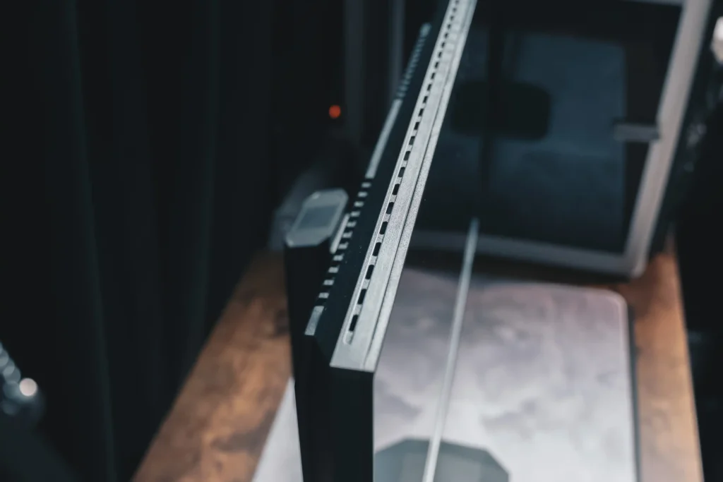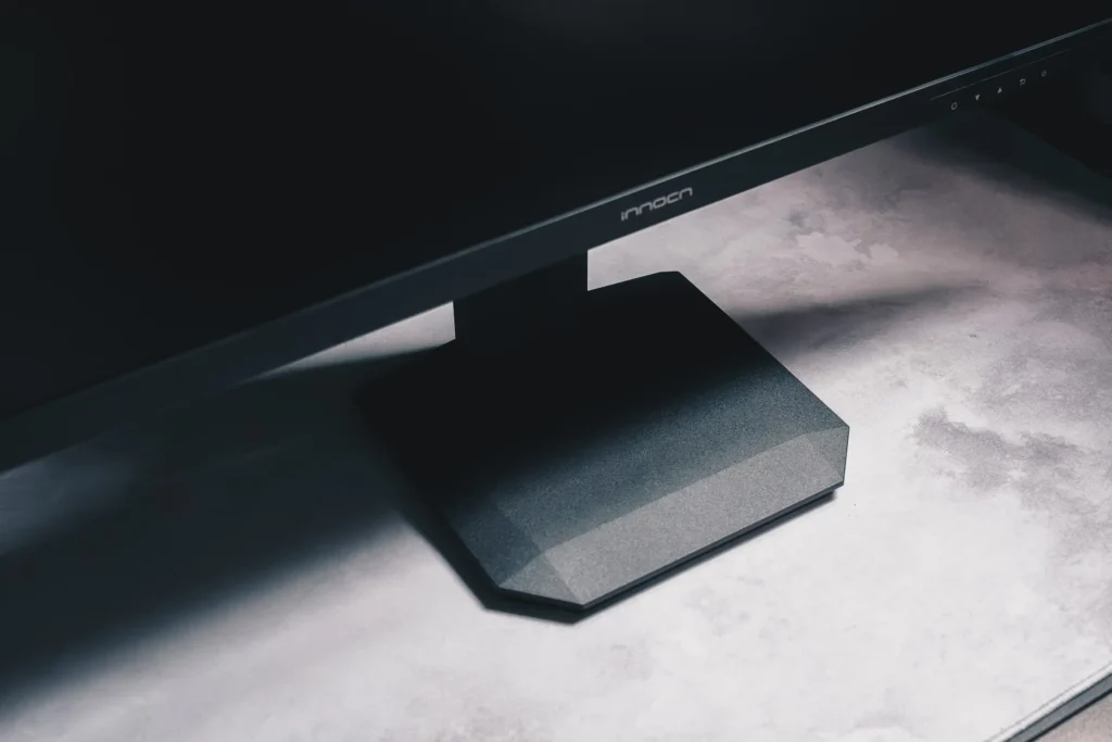 そして、このモニターの印象を決める大きな要素がスタンドの存在感です。見た目はやや“ごつめ”で、細身というよりはしっかり支えるタイプ。金属調の質感で、台座の面積も広く、安定感があります。しかし、僕は思う。なぜこの手のものは台座が太くてダs以下略。