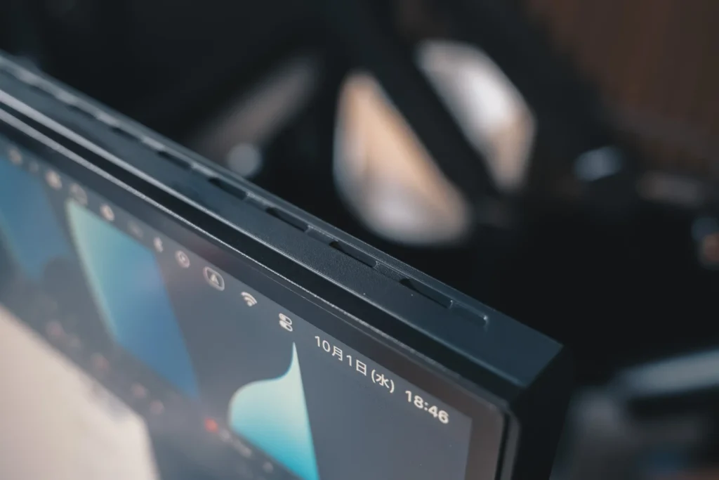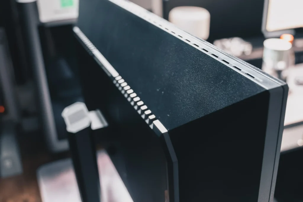 前面はとてもシンプル。ベゼルが細く、画面の境目が主張しすぎないので、映像やテキストが自然に目に入ってきます。長時間作業していても気が散らず、純粋に「表示されるもの」に集中できます。下側にはブランドロゴが入っています。