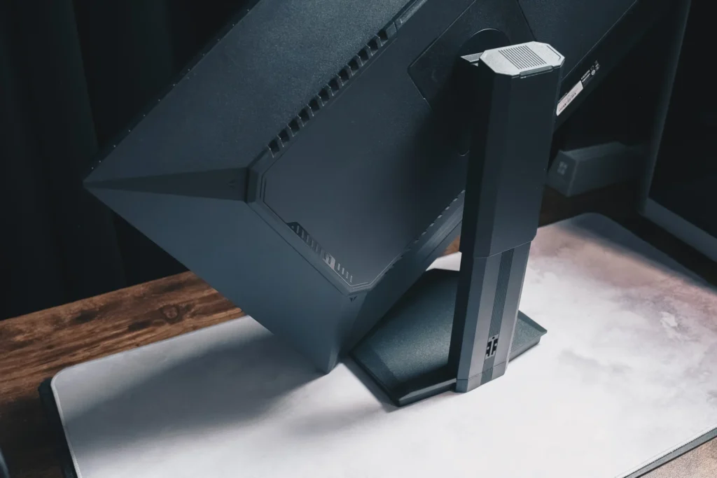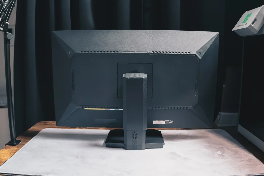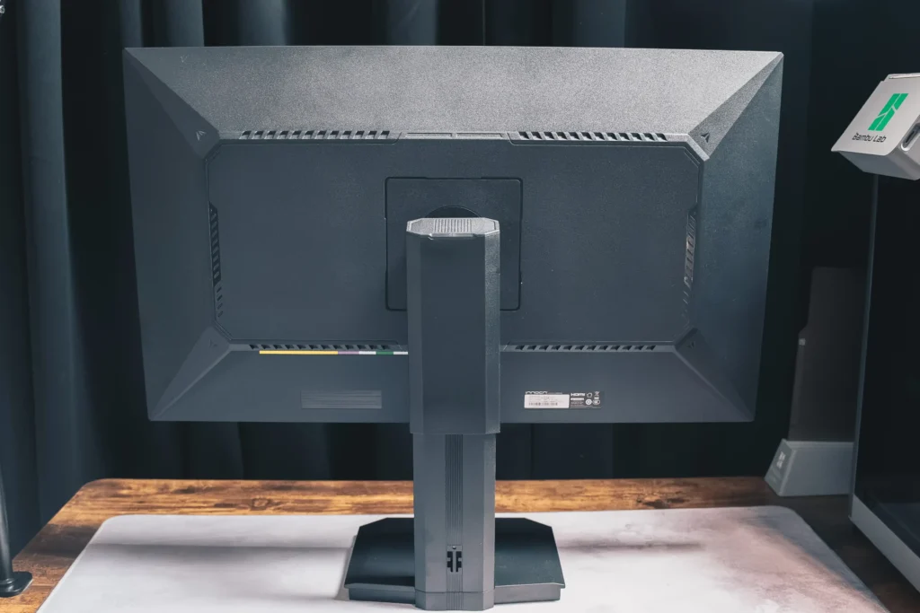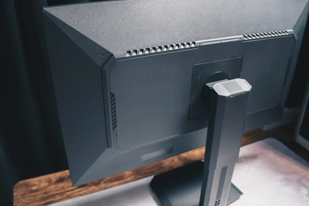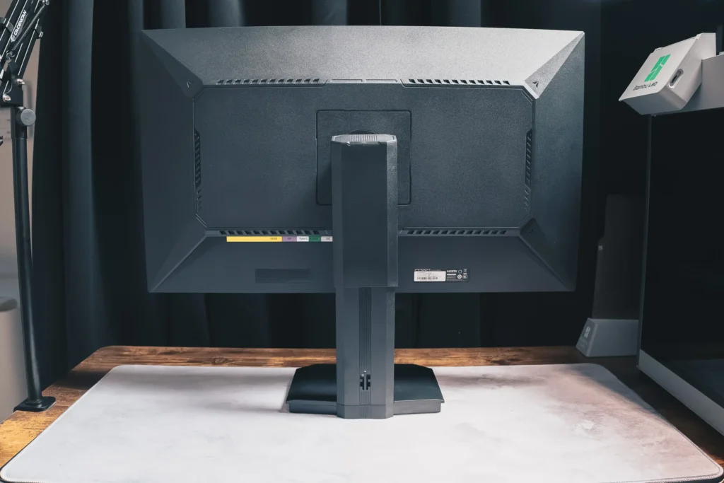 背面はフラットで実にシンプルで、マットブラックで派手さもない。ただし、見立ての通り、ケーブルを通す穴がないので、スタンドを取り付けての使用には、ケーブルの配線整理には向いていないでしょう。