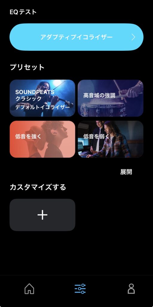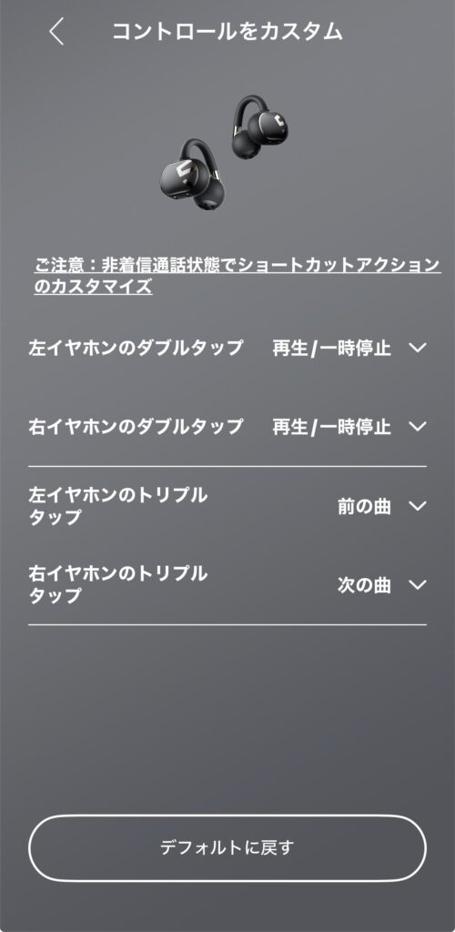 アプリ上からイコライザー調整が可能で、あらかじめ用意された音質プリセットを切り替えたり、自分の好みに合わせて音の傾向を調整できます。また、タッチ操作の割り当てを変更できるため、再生や曲送りといった基本操作を、自分の使い方に合わせて最適化できるのも実用的です。