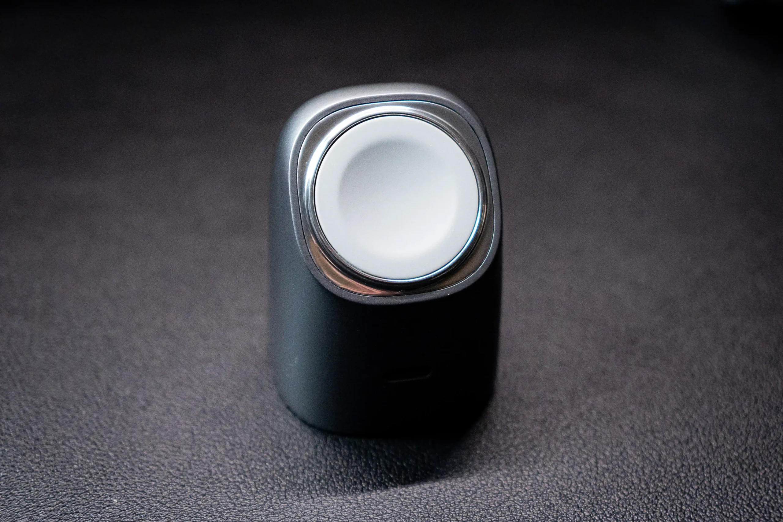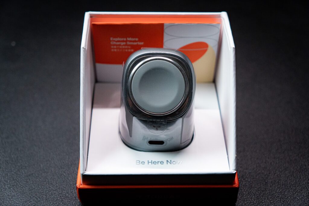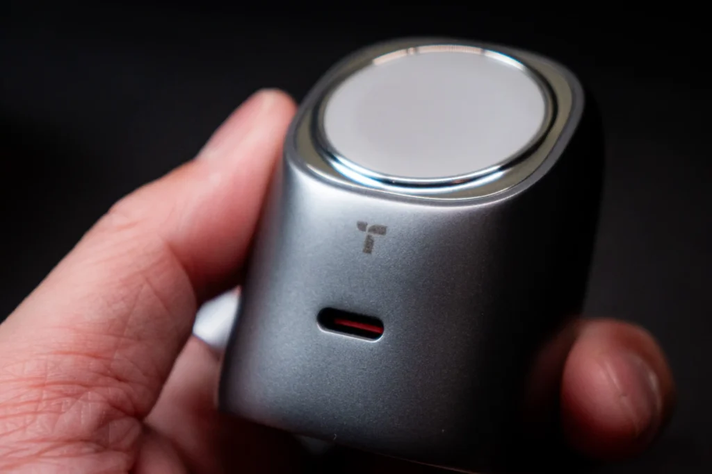 表面には微細なパール粒子を配合した特殊塗装が施されています。指を滑らせると、光沢でもざらつきでもないマットな質感が返ってきます。スペースグレーを選ぶと、MacやiPhoneと並べたときにデスク上で浮かない色調になります。「充電器が主張しすぎる」という状況を避けたい人には、この配色は正解です。